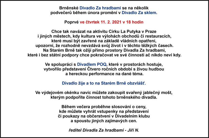 Improvizovaně rozehrajeme okna Divadla Za hradbami, viditelná z ulice Křížové, tématem Čtvera ročních dob. Společně s herci a spřízněnými dušemi divadla poq oživíme tento uzavřený prostor, kde obvykle hráváme. Snad zase brzy budeme. Nyní vás zveme k živému hraní přes sklo, živějšímu, než je teď jinak možné téměř jen přes různá média.